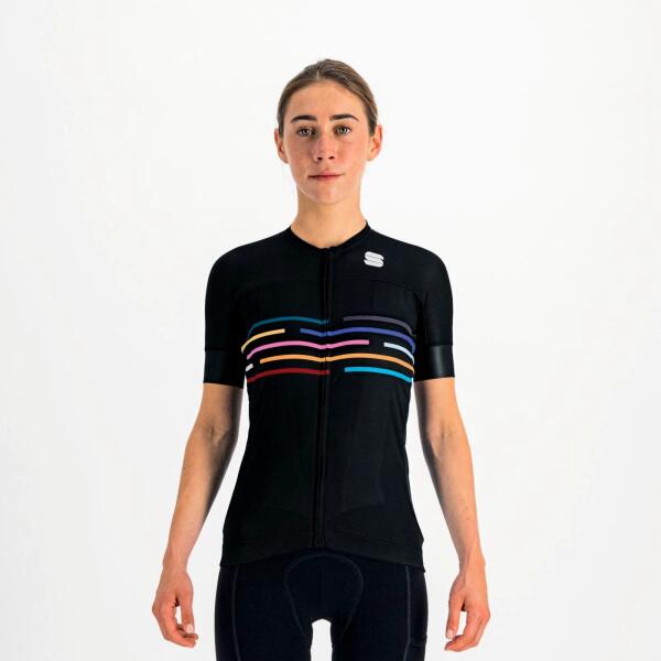 Női kerékpáros mez - rövid ujjú Típus: teljes cipzáras szétnyitható Anyag: 100% poliészter Szín: fekete Minta: logóval Zseb : hátsó