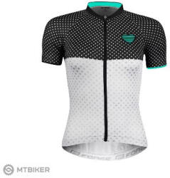 Kerékpáros női felsőrész. Rövid ujjú. Végig zippzáras, YKK zippzárakkal. Könnyű súlyú, nagyon jól szellőző anyag. Hátul 3 részes gumis zseb. Fényvisszaverő részletek. Anyag: 100% poliészter.