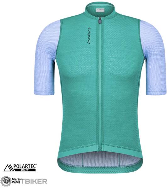 Rövid ujjú kerékpáros mez érdekes kivitelben, ergonomikus felépítésű lazább szabású, droptail, 4 zseb, csúszásmentes alsó szegély, poliészter, gyapjú, elasztán. Könnyű és rugalmas férfi mez rövid ujjú, meleg napokon kerékpározáshoz. A lazább szabást ergonomikusan kialakított gallér egészíti ki a kényelem érdekében. A teljesen nyíló cipzár felülről szövett