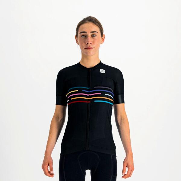 Női kerékpáros mez - rövid ujjú Típus: teljes cipzáras szétnyitható Anyag: 100% poliészter Szín: fekete Minta: logóval Zseb : hátsó