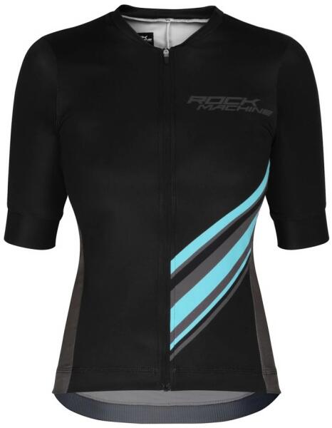 Női kerékpáros mez - rövid ujjú Típus: teljes cipzáras szétnyitható Anyag: 100% poliészter Szín: fekete - kék Minta: logóval Zseb : hátsó
