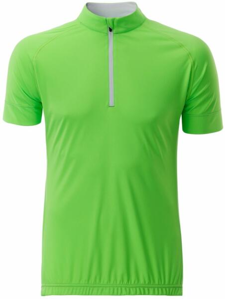 Férfi kerékpáros sport mez rövid cipzárral. Könnyű, kényelmes és gyorsan száradó anyagból készül, amely elvezeti az izzadságot. A derékrész rugalmas szilikonnal ellátott, a pólónak állógalléros szabása van cipzárral és állvédelemmel. A hátoldali részen egy praktikus nyitott háromrészes zseb és egy kis cipzáras zseb található. Anyaga: 100% poliészter, súlya 130