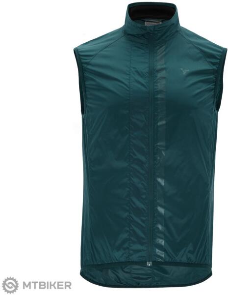 Könnyű férfi kerékpáros mellény meghosszabbított háttal, szélálló és lélegző Windbreaker anyagból. A mellény enyhén kiszélesedő szabású, állógallérral rendelkezik, a hátsó cipzáras zsebébe könnyen bepakolható.