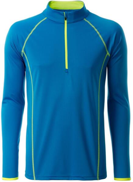 Férfi funkcionális hosszú ujjú felső sporthoz és fitneszhez lélegző, gyorsan száradó anyagból. Cipzáros állvédelemmel ellátott. Anyaga: 100% poliészter, súlya 130 g/m2 A felső megvásárolható női változatban is.