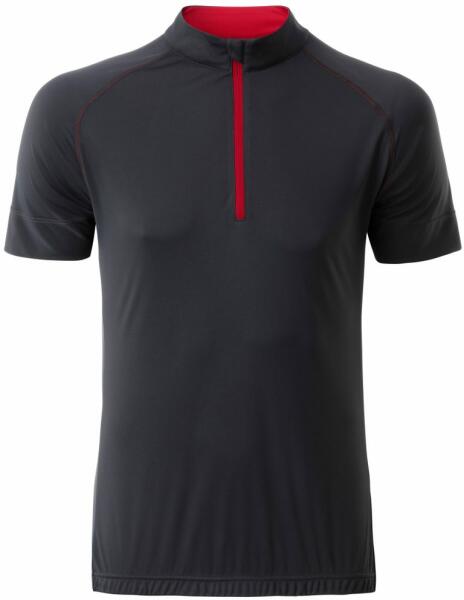 Férfi kerékpáros sport mez rövid cipzárral. Könnyű, kényelmes és gyorsan száradó anyagból készül, amely elvezeti az izzadságot. A derékrész rugalmas szilikonnal ellátott, a pólónak állógalléros szabása van cipzárral és állvédelemmel. A hátoldali részen egy praktikus nyitott háromrészes zseb és egy kis cipzáras zseb található. Anyaga: 100% poliészter, súlya 130