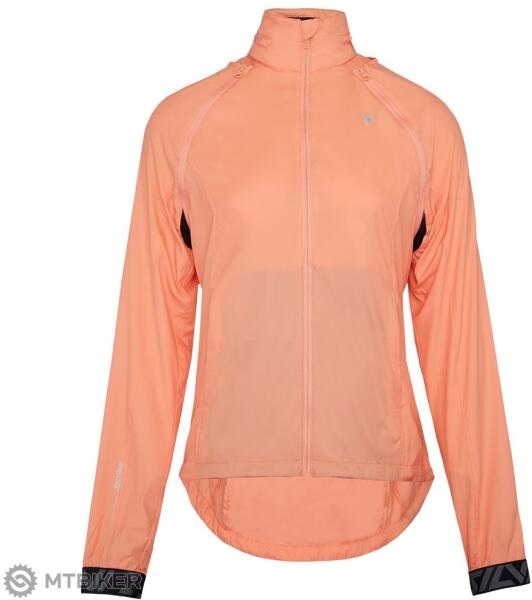 Női szélálló kabát Windbreaker anyagból, kis zsebbe csomagolható. Az ujjak kigombolásával mellényé válik, a kapucni gallérba hajtható. Három cipzáras zsebbel, alsó szegéllyel és reflexekkel rendelkezik.