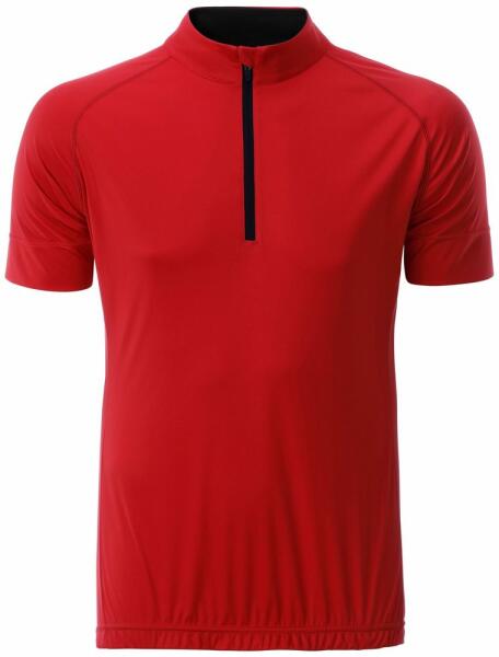 Férfi kerékpáros sport mez rövid cipzárral. Könnyű, kényelmes és gyorsan száradó anyagból készül, amely elvezeti az izzadságot. A derékrész rugalmas szilikonnal ellátott, a pólónak állógalléros szabása van cipzárral és állvédelemmel. A hátoldali részen egy praktikus nyitott háromrészes zseb és egy kis cipzáras zseb található. Anyaga: 100% poliészter, súlya 130