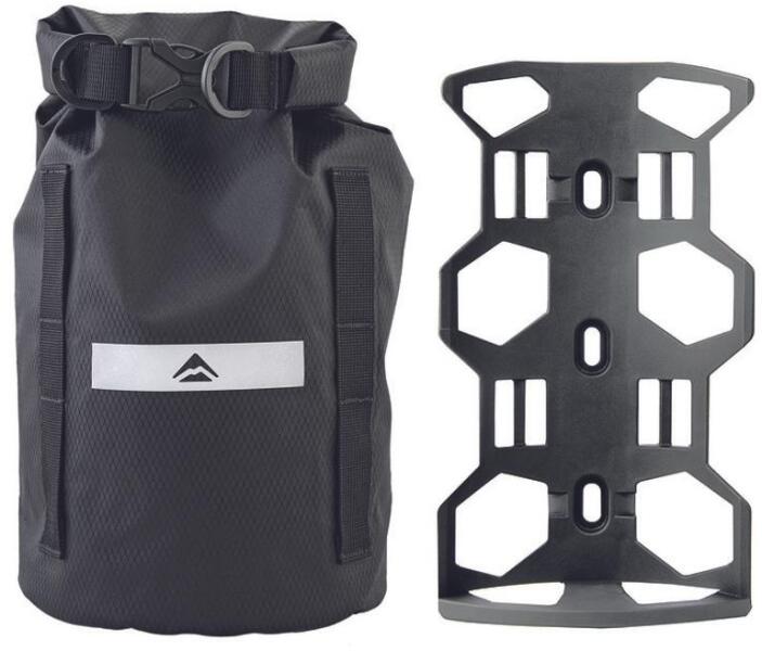 A 65 mm-enként elhelyezett 3 rögzítőlyuknak köszönhetően rugalmasan szerelhető a kulacstartó szemekre. A táska vízálló és fényvisszaverővel ellátott Maximális terhelhetőség: 3 kg Anyaga: 210D Diamond TPU Méret: 170 300 mm Tömeg: 300 g (táska+tartó) Térfogat: 5 liter.