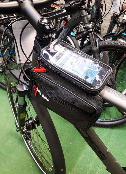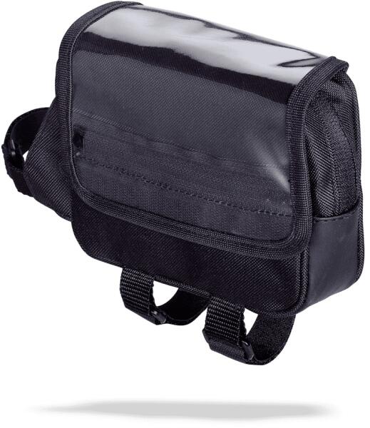 Felső vázcsőre szerelhető kerékpáros táska. -Tépőzáras felsőrésszel, cipzáros zárral -Áramvonalas forma -Egy tároló rekesz -Felül átlátszó zseb térképnek -Csúszásmentes gumis alsó rész -Mérete: 150 x 100 x 40 mm