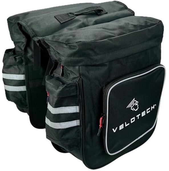 Velotech kétrészes hagyományos túratáska Anyaga: 600D vízálló cordura, PE erősítéssel, Szín: fekete, fényvisszaverő szegéllyel, Belső merevítés a stabil tartásért, Két oldalsó és hátsó zseb, 6 ponton rögzíthető (oldalt 2 csattal, felül 4 hevederrel), Tetején fogantyúval, Méretei: 2 x 30x13x30cm Térfogat: 2x 12 liter Súlya: 0,8 kg