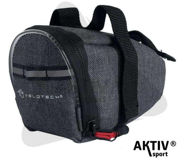 Nyeregtáska világítással Technikai adatok: - Anyaga: 600D vízlepergető polyester - Szín: Sötét szürke - Tépőzáras pántok a gyors fel- és leszereléshez - Piros bevarrt szegély világítás, folyamatos és villogó üzemmóddal, 2xCR2032-es elemmel (tartozék). - Méret: 14 x 10 x 7,5 cm - Űrtartalom: 0,85 liter