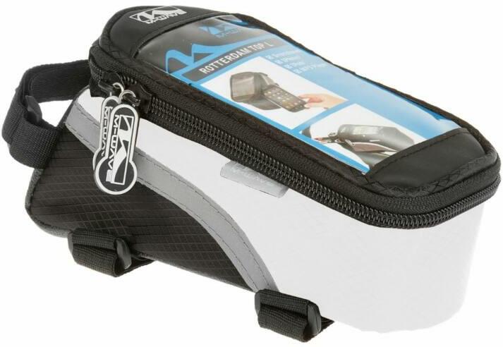 M-Wave Rotterdam Top L felsőcső táska telefon tartóval, 1L, fekete-fehér Felsőcső váz táska Erős víztaszító táska anyagból készült 3 univerzális tépőzár Biztonság növelő fényvisszaverő csíkok 270° fokban nyitható felsőrész Párnázott ütés/rezgés csillapító kialakítás Az érintőkijelző használható az áttetsző borítón keresztül is A legtöbb divatos mo