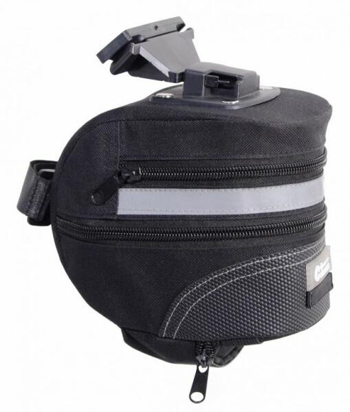 Vízlepergető anyagból készült, és fényvisszaverő szalaggal van ellátva a kerület körül. Két gumiszalag az alsó oldalon más apró tárgyak rögzítéséhez a táskához. Szerelési útmutató: A táskatartó alulról az ülésre van felszerelve. A csavarok és a lábak a termék részét képezik. Végül a táska a tartóba csúszik. Termék részletek: belső térfogat: kb. 1,5 - 2