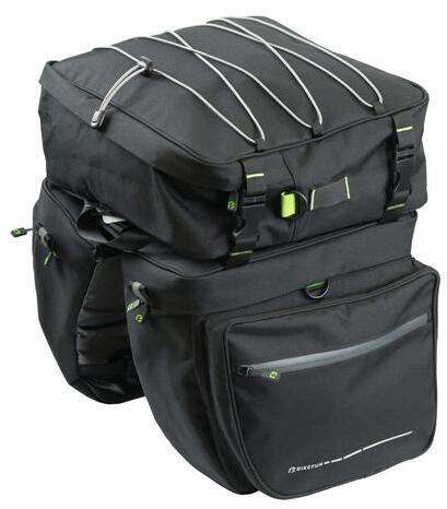 Tulajdonságok BFPB02Dupla túratáska 2 in 1 - 600D rPET (újrahasznosított anyag) - W/R kezelés (vízlepergető) - Könnyű rögzítés tépőzáras pántokkal - A külső húzózsinórok extra tárolást tesznek lehetővé - Vízálló cipzár - Belső rekeszek és zsebek - Külső zsebek - Levehető csomagtartó táska önmagában is használható - Hatalmas kapacitás különböző tároló
