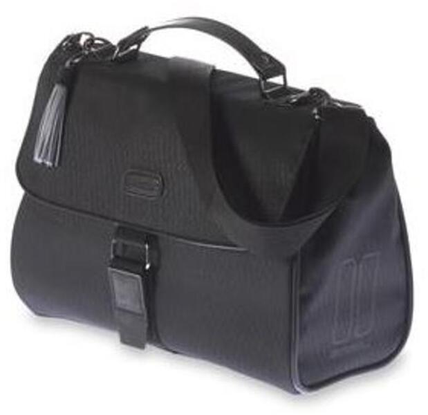 BASIL NOIR CITY BAGkézitáska, fekete a feketén kobra mintás, belső zsebbel, vállpánttal, BasEasy rendszerhez (NEM TARTOZÉK), Basil adapter tálcával, fényvisszaverő csíkokkal és húzókával, tépőzárral és tekerve záródik , vízálló (IPX 3), 6L-es, éjfekete. Használható adapterek: 57800003, vagy 57800005, vagy 57800015, vagy 57800001 a megfelelő méretű gyűrűvel (578000