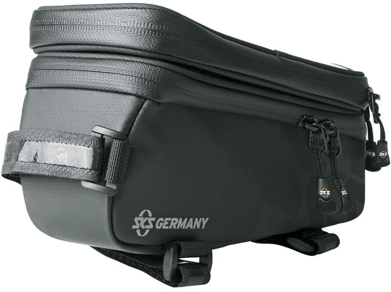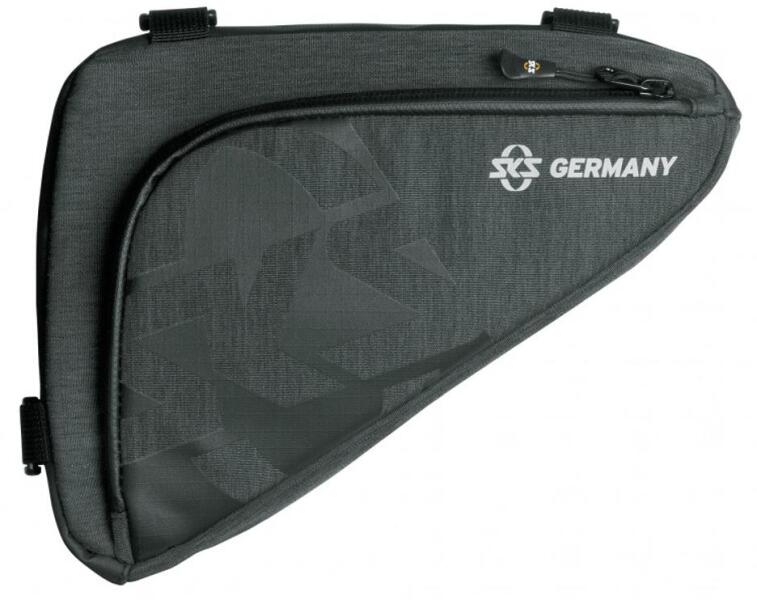 Az okos SKS Germany Explorer Smart kerékpáros váztáska érintőképernyőv el kompatibilis, levehető telefontokkal és integrált zsebbel apróságoknak gumírozott vízálló anyagból készül. Az oldalain található fényvisszaverő elemek biztosítják a nagyobb biztonságot sötétedés után. A táska a vázra könnyen rögzíthető egy tartós gumírozott tépőzár segítségével,