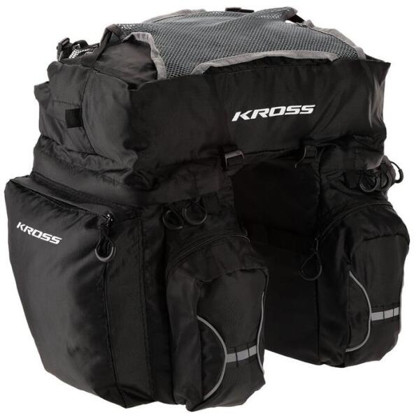 A Kross Roamer Triple három részes csomagtartótáska ideális választás kerékpár túrákhoz. Három, cipzárral zárható nagy rekesze bőséges helyet kínál a csomagoknak, a táska tetejébe varrt hálónak köszönhetően pedig könnyen rögzíthető rá esőkabát, hálózsák vagy más holmi, ami már nem fért be táskába. Oldalt és hátul több kisebb zseb található az apróbb d