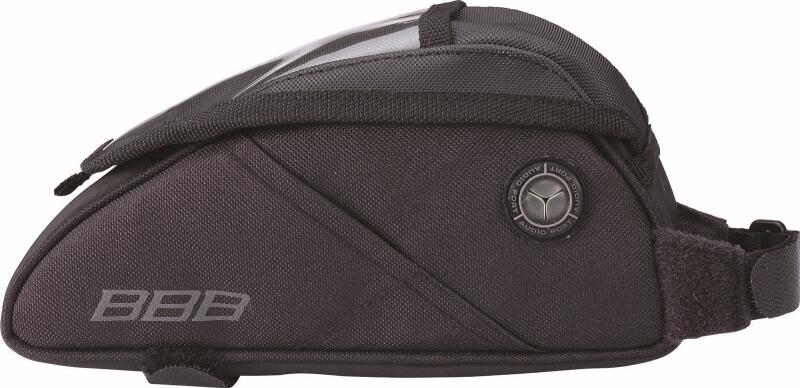 Felső vázcsőre szerelhető kerékpáros táska. -Tépőzáras felsőrésszel -Áramvonalas, döntött forma -Belül középen egy nagy tároló rekesz, két oldalán hálós zseb -Felül átlátszó zseb -Csúszásmentes gumis alsó rész -Oldalt fényvisszaverős BBB grafika -Két nagy tépőzáras heveder -Mérete: 80 x 55 x 200 mm -Űrtartalma:550 cm3