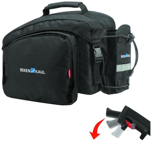 Klickfix Rackpack 1 Uniklip2 , fekete csomagtartó táska bármilyen csomagtartóra, Uniklip 2rögzítéssel, lehajtható oldalzsebekkel. A táska oldalfalai párnázottak, így stabilan áll a csomagtartón. A fő rekesz dupla cipzárral van ellátva, valamint egy további szövetfedéllel, amely alatt nedves kabát is elhelyezhető. Hátsó részen kulacstartó rekesz, valamint lámpatartó, fog