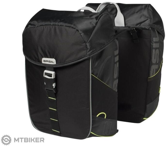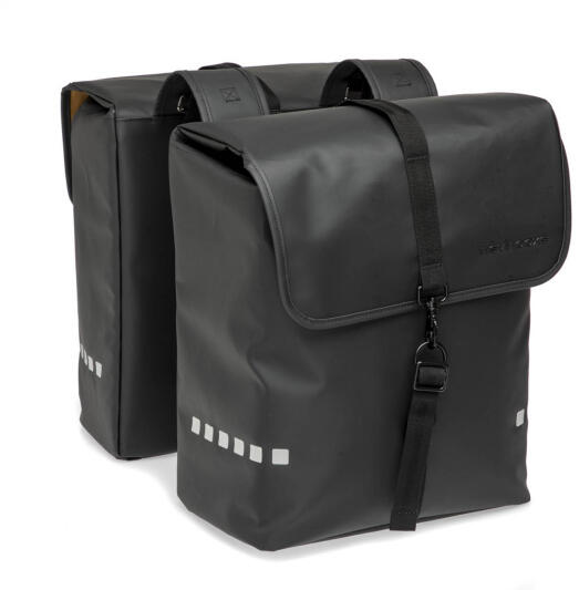 A Basil Miles Double vízálló dupla táska 32 literes űrtartalommal. Az oldalán két extra rugalmas zseb található, amelyek kényelmesek egy italos üveg vagy egy esernyő szállítására. Ideális bevásárlás szállításához vagy szabadidős kerékpározáshoz. Ha hirtelen elkezd esni az eső, a holmid szárazak maradnak. A táska vízálló, tekercs tetején záródik, felső füllel.
