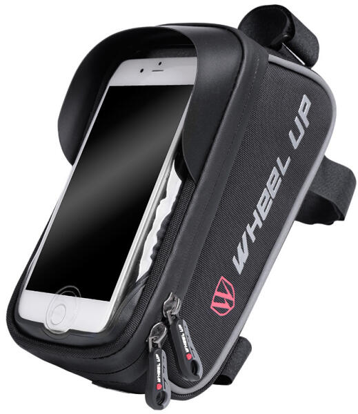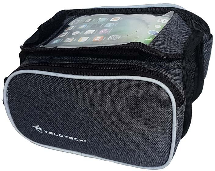 Telefontartós váztáska 3 részes, Anyaga: 600D vízlepergető polyester, Szín: Sötét szürke, Méret: 18 x 11 x 13 cm, Átlátszó PVC felsőrész a telefon használatához. Tépőzáras kivitelezés a gyors le és felszereléshez. A legtöbb fajta kerékpárhoz megfelelő. Fényvisszaverő csík körben a széleken.
