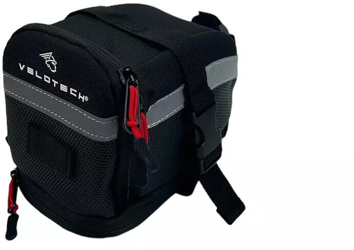 Velotech nyeregtáska, tépőzáras, bővíthető, fényvisszaverő csíkkal, 1,3L, fekete Kerékpár nyeregtáska fényvisszaverővel, bővíthető űrtartalommal, tépőzáras rögzítőpántokkal. Átlagosnál kicsit nagyobb méretű nyeregtáska, arra az esetre ha sok holmit kell magaddal vinned. Alsó cipzárral bővíthető vagy szűkíthető a belső tér, az aktuális igénynek megfelelőe