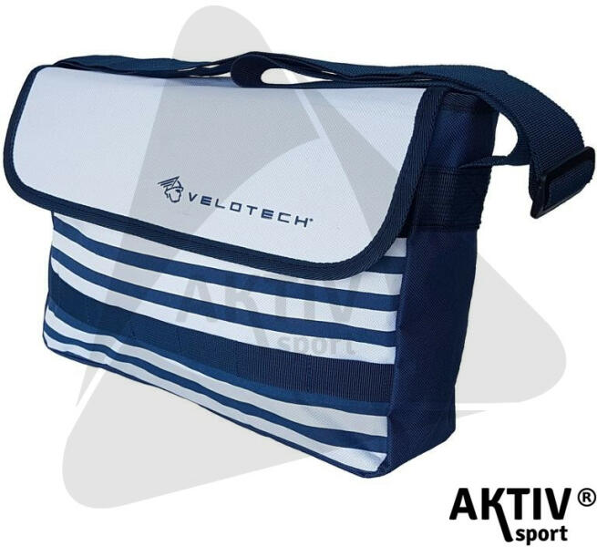 Velotech tengerész-csíkos kormánytáska. Belső habszivacs védelem. Egy nagyméretű rekesz a könnyű pakolhatóságért. Cipzárral és ráhajtható fedéllel záródik. Vállpánttal válltáskaként is használható. Technikai adatok: - Anyaga: 600D vízlepergető poliészter - Rögzítése: 3 tépőzárral. - Szín: Kék-fehér csíkos - Méret: 33 x 25 x 9 cm - Űrtartalom: 7,5 liter
