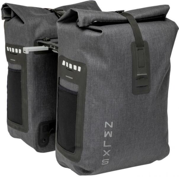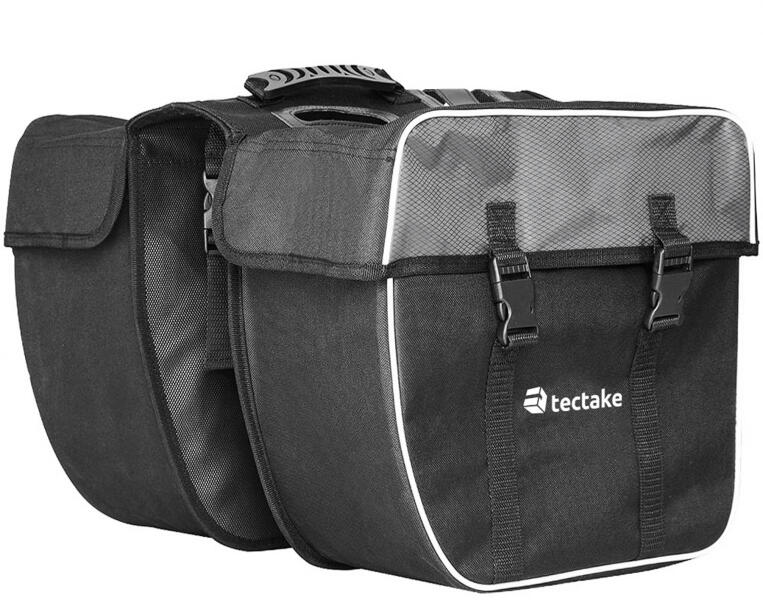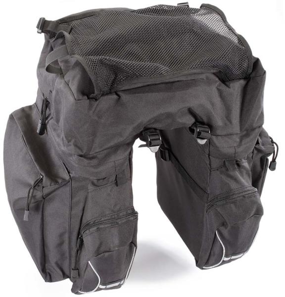 3 részes csomagtartóra szerelhető táska 30 liter űrtartalom, három kényelmes, nagy rekesz, két kisebb zseb, hálós rögzítő a tetején további csomagok szállításához, fényvisszaverő elemek, mérsékelten cseppálló