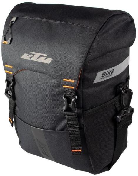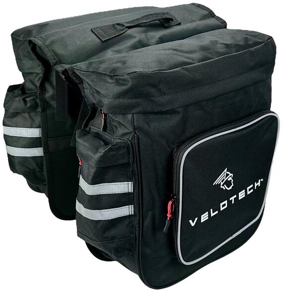 Kétrészes hagyományos túratáska, Anyaga: 600D vízlepergető polyester, Szín: fekete, fényvisszaverő szegéllyel, Belső merevítés a stabil tartásért, Két oldalsó és hátsó zseb, 6 ponton rögzíthető (oldalt 2 csattal, felül 4 hevederrel), Tetején fogantyúval, Méretei: 2 x 30x13x30cm, Térfogat: 2x 12 liter, Súlya: 0,8 kg