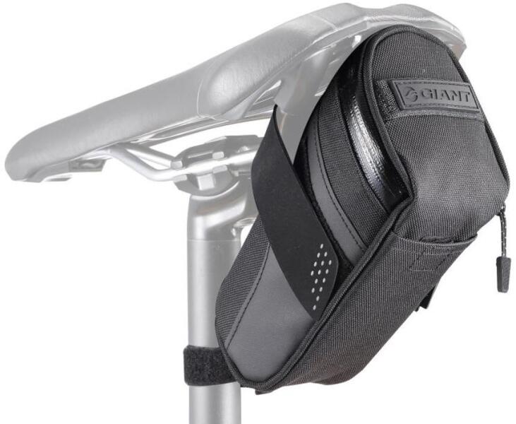 Giant Shadow DX Seat Bag's feature water resistant ProTextura fabric construction with a water-proof zip, in a slimmer design that fits neatly under performance road bike saddles. A simple anti-slip hook and loop Velcro® strap fitting allows easy removal and fitting and the reflective strip offers improved low light visibility with a tail light hanger for adding your own light.