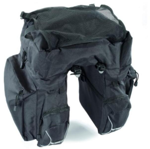 30 liter űrtartalom, Csomagtartóhoz illeszkedő felfogatás, Három kényelmes, nagy rekesz, Két kisebb zseb, Fényvisszaverő elemek, Hálós rögzítő a tetején további csomagok szállításához, Klasszikus, jól bevált forma, 100% poliészter, Mérsékelten cseppálló, Gepida design