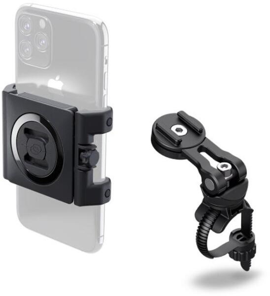 Az SP Connect univerzális okostelefon tartó segítségével másodpercek alatt rögzítheti telefonját kerékpárjához. Rögzítse a tartót a két rögzítési lehetőség (állítható karral vagy anélkül) egyikével a kormányra vagy a kormányszárra. A telefont rá kell helyezni a tartóra és az óramutató járásával megegyező irányba 90 fokkal elforgatni. Okostelefonja most már