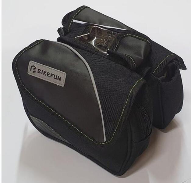 Váztáska Kétrekeszes váztáska, mobiltelefon tartóval Alapanyag: 600D poliészter, 420D nylon Tépőzárakkal a homlokcsőhöz, vagy a nyeregszárhoz is rögzíthető Fényvisszaverő csíkokkal, és esővédő huzattal Mérete: 16 × 5 × 13 cm Űrtartalom: 1 l