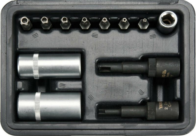 YATO YT-12007 Légkondícionáló szerelő készlet VW, Audi, Opel és más autók klímaszelepeihez tervezve. tartós CrV acélból készült tartalmaz 12 és 15 mm-es nyolcszögű foglalatokat, 2,2 és 3,2 mm-es foglalatokat lapos kulcsokhoz, adaptert és biteket TS10-től TS40-ig furattal meghajtó: 1/4" praktikus bőröndbe csomagolva A YT-12007 cikkszámú készlet egy 12 darabos klímaberend