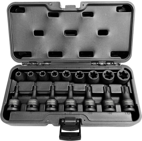 Kemény króm molibdén acélból készült Fekete oxid bevonat a szerszámok hosszabb élettartamához Kemény, ütésálló műanyag tároló tokban szállítva a foglalat védelme érdekében Rézkarcolt jelölések a gyors és egyszerű kiválasztáshoz Tartalom Torx meghajtók 55 mm hosszú: T40, T45 , T47, T50, T55, T60, T70 Torx foglalatok: E10, E11, E12, E14, E16, E18, E20, E22, E24 szabv