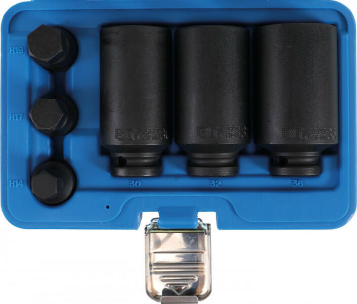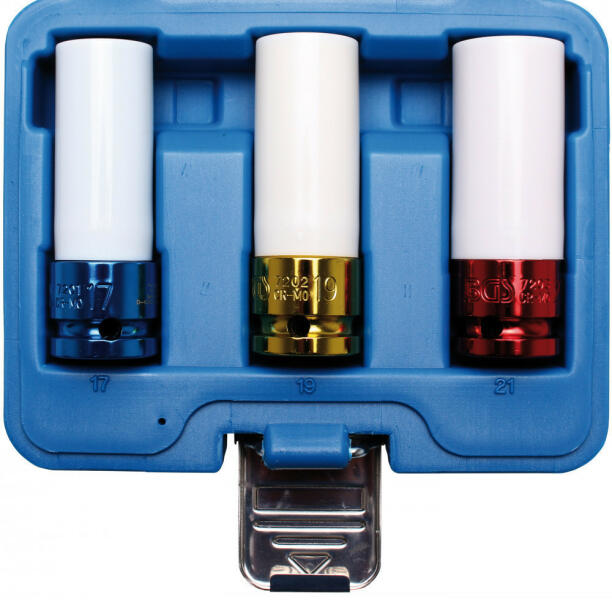 Jellemzők: alkalmas kézi és ütvecsavarozó csavarkulcsok használatára rögzítőcsapos és gumigyűrűs befogóval műanyag köpeny és műanyag betét az alumínium felnik védelmére színkódolt anya, a kívánt méret könnyebb megtalálása érdekében külön is beszerezhető a BGS 7201, 7202, 7203 alatt Tartalék műanyagköpeny, beszerezhető BGS 7204, 7205, 7206 alatt Szállítási