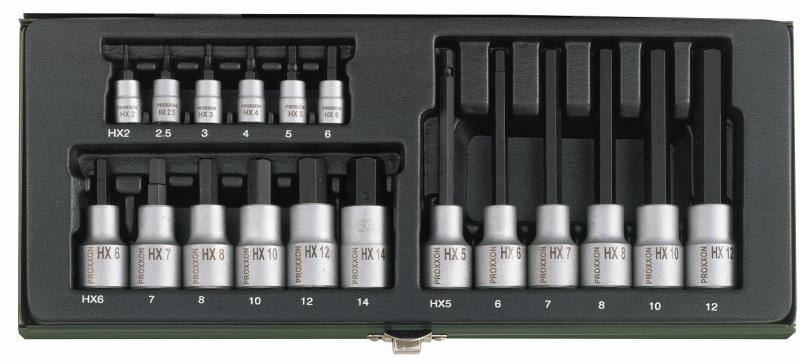 18 részes speciális készlet belső hatszögcsavarokhoz, 6,3 mm + 12,5 mm (1/4" + 1/2") Műszaki adatok: Anyag: Króm-vanádium acél · Elhajtás: Belső hatlap · Meghajtás: 1/4" (6.3 mm), null · Típus: Dugókulcs bit betét készlet Szállítás tartalma: 6,3 mm-es (1/4") négyszögmeghajtáshoz és max. 25 Nm indító nyomatékokhoz: méret 2 - 6 mm · 12,5 mm-es (1/2") négyszögmeghajt