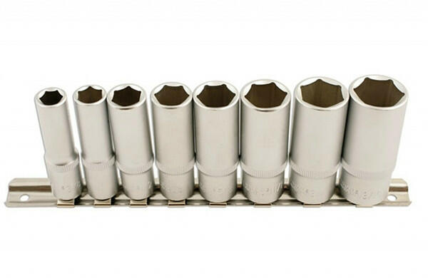 Hosszú, colos dugókulcs készlet, 6 lapú fej kialakítással, 8 darabos kiszerelés. Méretek: 3/8", 7/16", 1/2", 9/16", 5/8", 11/16", 3/4", 13/16" Hossza: 63 mm Súly: 1,2 kg Szín: ezüst Anyag: Chrome Vanadium acél