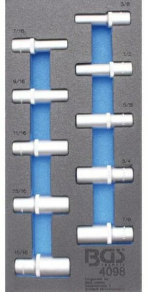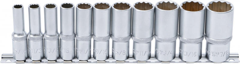 Jellemzők: bordázott fémsínen Szállítási terjedelem: 1 Dugókulcsbetét, tizenkétszögletű, mély, 10 mm (3/8") 5/16" 1 Dugókulcsbetét, tizenkétszögletű, mély, 10 mm (3/8") 11/32" 1 Dugókulcsbetét, tizenkétszögletű, mély, 10 mm (3/8") 3/8" 1 Dugókulcsbetét, tizenkétszögletű, mély, 10 mm (3/8") 7/16" 1 Dugókulcsbetét, tizenkétszögletű, mély, 10 mm (3/8") 1/2" 1 Dug