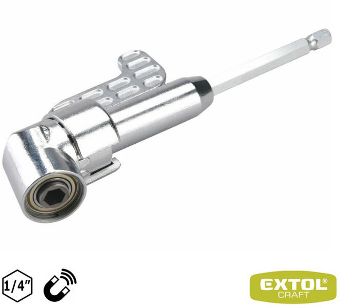 Sarokcsavarozó adapter 1/4" bit 105 o Max. 25 Nm Csavarozáshoz és fúráshoz szűk helyeken. Az 1/4" hatszögletű szár fúróba vagy akkus csavarhúzóba fogható. Csapágyazott hajtás, 1/4"-os mágneses rögzítés a bitek vagy bit fúrószárak számára.
