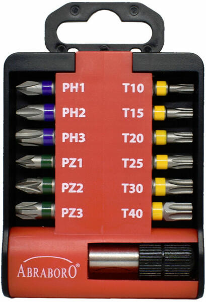 ABRABORO 13 részes bitkészlet Készlet tartalma: 1x PH 1 | PH 2 | PH 3 1x PZ 1 | PZ 2 | PZ 3 1x Torx 10 | Torx 15 | Torx 20 | Torx 25 | Torx 30 | Torx 40 1x mágneses bitszár 1/4" x 58 mm A kép csupán illusztráció!