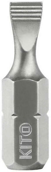 KITO Bit behajtóhegy lapos Kiválóan illeszkedik a csavarfejhez Kézi és gépi csavarozóval is használható Felületkezelése ellenállóvá teszi a korrózióval szemben Tartós és strapabíró A kép csupán illusztráció! Műszaki adatok Méret: 5,5 × 25 mm Fej típusa: lapos Anyag: S2 osztályú acél Keménység: 61-62 HRC