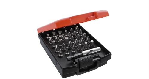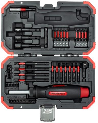 Tartalmaz egy mágneses racsnis csavarhúzót, 36 torziós bitet a PH, PZ, SL, IN, TX profilokban 25 mm, 50 mm és 90 mm hosszúságban, valamint mágneses dugókulcs betéteket az SW 8, 10, 13-ban Ezeket kiegészíti egy praktikus 1/4''-os gyorscserélő adapter, valamint egy 1/4''-es meghajtó adapter és 3/8'' meghajtó adapter Praktikus tárolás egy praktikus műanyag tokban, GEDORE piros kiv