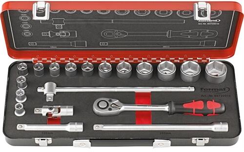 "Hatszög dugókulcs készlet 1/2"""" FORMAT, 19-részes Kivitel: Króm vanádium acélból készült szerszámok, a belső hat- és négyszögek lekerekített sarkakkal rendelkeznek a profil és a csavarfej kímélése érdekében. Szállítás stabil, festett fém kazettában, hordozó fogantyúval. A szerszámok biztonságosan rögzítve helyezhetők el a kétszínű habszivacs betétben, így