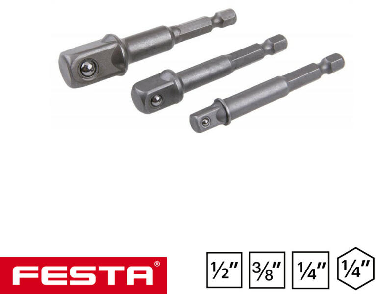 Dugókulcs adapter készlet CrV. Fúrógépbe fogható dugókulcs adapterek. 1/4"-os bit befogással. 1/4"-os, 3/8"-os és 1/2"-os dugókulcsokhoz használhatók.