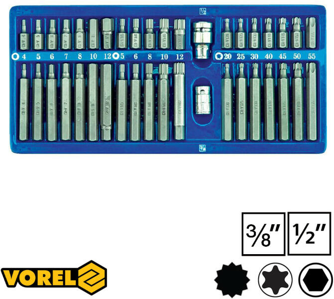 Imbusz, Torx, Spline bithegy készlet fémdobozban Adapter CrV6150 acélból: 1/2" vagy 3/8" négyzet >>>10 mm bit Bitek CrV acélból HEX4-HEX12, T20-T55, M5-M12 méretek Imbusz, Torx, Spline bithegy készlet (40 részes) Adapter CrV6150 acélból: 1/2" vagy 3/8" négyzet >>>10 mm bit Bitek CrV acélból Fémdobozban Készlet tartalma: 1/2" négyzet >>>10mm bit adapter