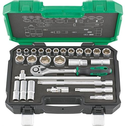 Dugókulcs készlet 1/2'' Matt krómozott Króm-vanádium acél, kovácsolt Golyóhorony Jó fogású recézés Szállítás: Habanyag betétes műanyag kofferben és a fedélben a szerszámok helyét mutató sémával. Tartalom: 1 irányváltó karos racsni 16 hatszög dugókulcs betét 10 | 11 | 12 | 13 | 14 | 15 | 16 | 17 | 18 | 19 | 21 | 22 | 24 | 27 | 30 | 32 mm 3 hatszög dugókulcs betét |