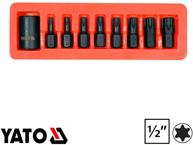 Gépi dugókulcs Torx bit készlet 1/2" - 9 részes Bitek S2 acélból (L=38 mm): T30-T40-T45-T47-T50-T55-T60-T70 1/2" átalakító adapter a bitekhez, CrMo acélból 9 darabos Torx ütvecsavarozó készlet autós és gépészeti szerelésekhez Foszfátozott felület 1/2" adapter bitekhez (ütésálló, tartós CrMo acélból) Bitek S2 acélból (L=38 mm): T30-T40-T45- T47 -T50 -T55-T60-T70