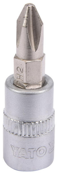 Bithegy dugófejjel, 1/4 col - CrV - PH2, autóipari vagy mechanikai felhasználásra. Foglalat mérete 1/4", Méret: PH2. AISI S2 acélból készült és nikkelezett csap. Pótolhatatlan eszköz egy autóban vagy gépészeti műhelyben Hossz: 37 mm Max nyomaték: 8,2 Nm Felület: krómozott, szaténozott, nikkelezett Keménység: 58-62 HRC Anyag: S2, CrV 6150