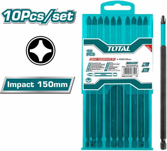 10 db ütvecsavarozó készlet 150mm / INDUSTRIAL (TACIM16PH263) Az ún. ütőbitek TOTAL TACIM16PH263 szettje 10 darab bitet tartalmaz, amelyek szilárd anyagokkal való munkavégzéshez használatosak. Az ütőbitek ipari S2 acélból készülnek, ami nagyobb szilárdságot és hosszabb élettartamot biztosít számukra. Minden egyes ütőbit hossza 150 mm. A hegy típusa PH2 (kereszthornyos). A
